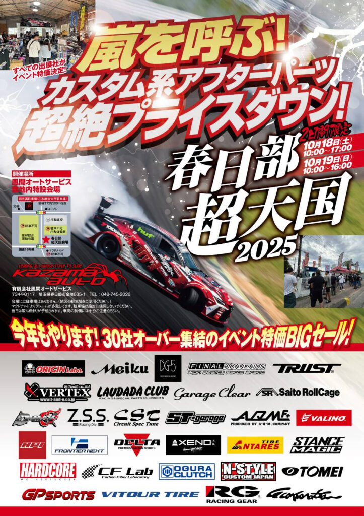 来る10月18日(土)、19日(日)に開催される風間オート様主催の「春日部超天国2025」弊社A・Q・M. Companyも出展いたします。すべての出展社ブースで物販などがイベント特価で販売されるBIGセールとなります。この機会にぜひお時間ある方は会場に足をお運びください。